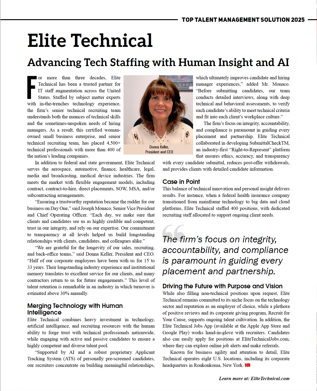 Said Donna Keller, Elite Technical President and CEO, "Our 33 years in the staffing industry has been exceptionally gratifying. We are blessed with a terrific team that truly cares about our clients and candidates - making it possible for us to deliver highly effective people to our clients. The potential of AI is wonderful, but the human talent and insight behind technical innovation brings the real power. We are lucky to play a role in providing those people."